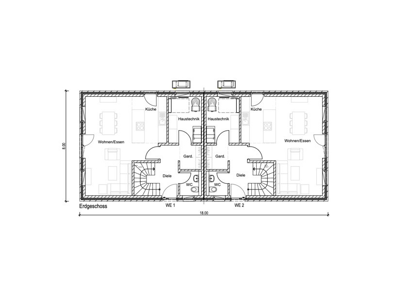 Es handelt sich um ein Neubau-Doppelhaus in Massivbauweise mit klassischem Satteldach, geplant nach den Vorgaben des Gebäudeenergiegesetzes (GEG). Je Wohneinheit erstrecken sich zwei Ebenen mit Wohnen/Essen im Erdgeschoss und drei Schlafräumen im Dachgeschoss; moderne Haustechnik wie Luft-Wasser-Wärmepumpe, kontrollierte Be-/Entlüftung und 3-fach-Verglasung ist vorgesehen.