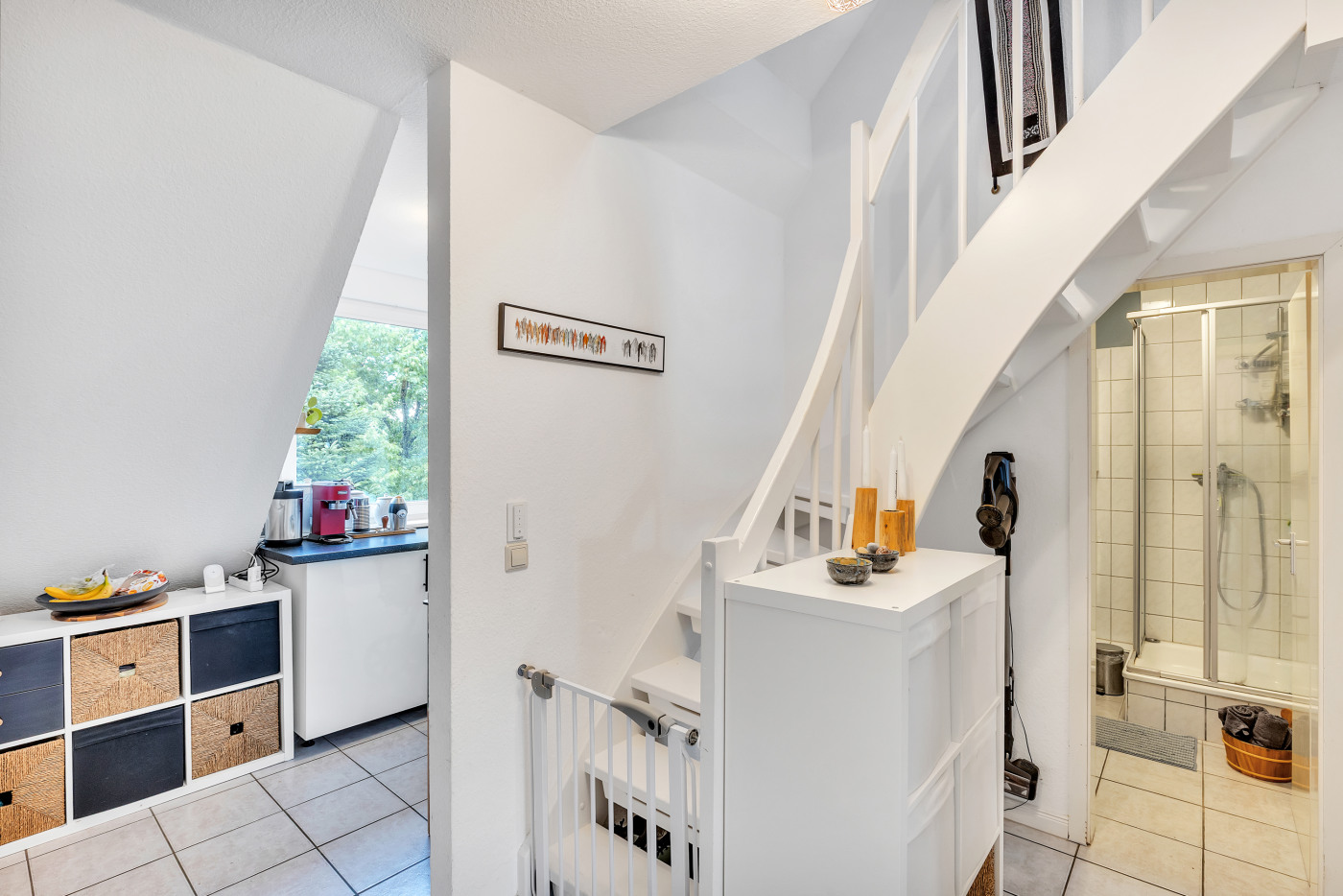 -Eingangs-/Wohnebene: Diele, modernes Duschbad, Kinder-/Gästezimmer, separate Küche, Wohn-/Essbereich mit Balkonausgang