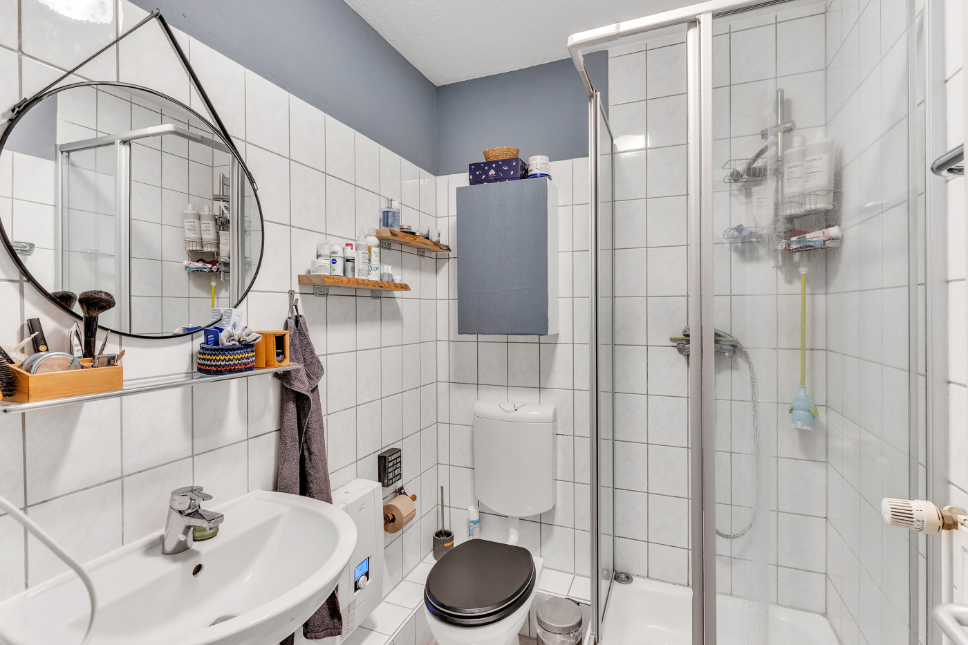 -Gepflegtes Duschbad, hell gefliest mit Glaskabine