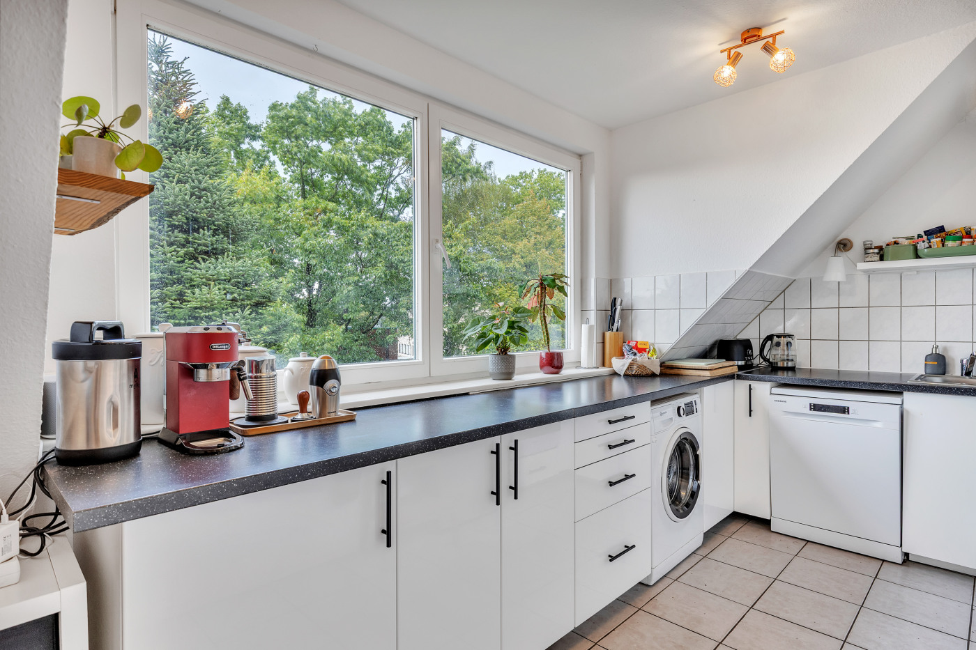 -Einbauküche mit weißen Fronten, Spülmaschine, Herd/Backofen und Stellplatz für die Waschmaschine